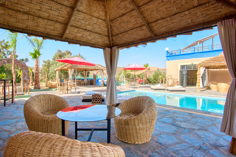 Dans cet espace naturel ouvert qui s’étend sur plus de 5000m², vous serez invités à déguster un bon cocktail de jus au bord de la piscine, profiter d’une bonne baignade avec un bain de soleil relaxant, admirer le calme et les sons de la nature et apprécier les paysages panoramiques des collines et des montagnes de l’Atlas.